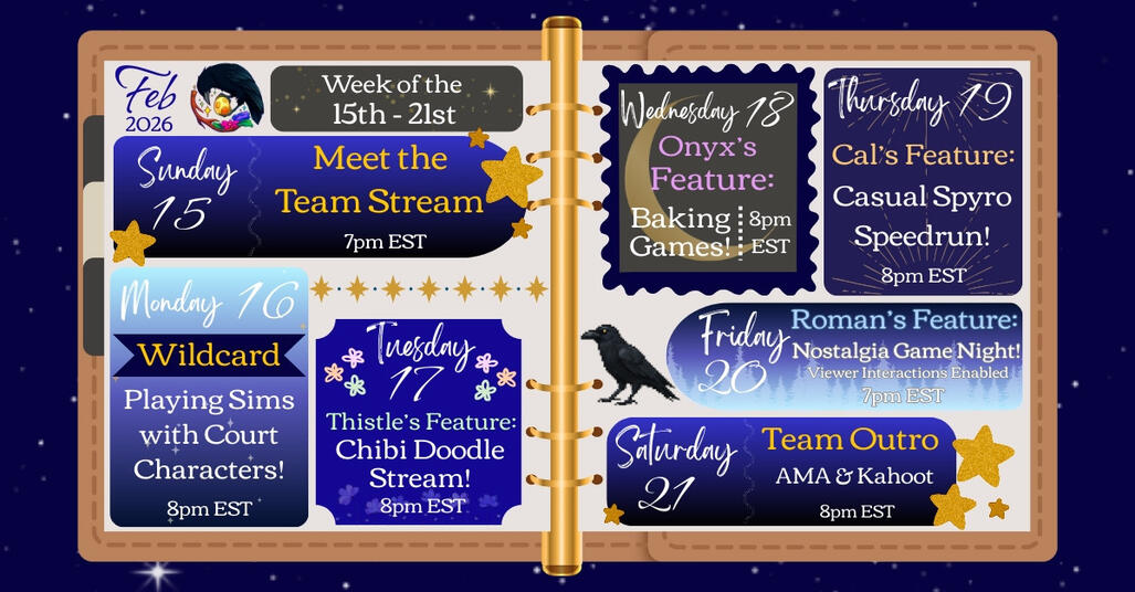 Hello, and welcome to the Solstice Court! We are a group of Twitch streamers who play games, create art, and love to hang out with new friends.The Court contains four distinct realms, each belonging to a different member and season. These spaces are reflections of their worlds: from the hallowed grounds of the Soulhollow to the lively warmth of the Hatchery, the whispered divinations of the Oracle's Altar, and the whimsical curiosities of the Verdant Bounds.Please feel free to look around and join us amongst our other social platforms. Our official debut week on Twitch is 25Jan26 to 31Jan26 ❤️