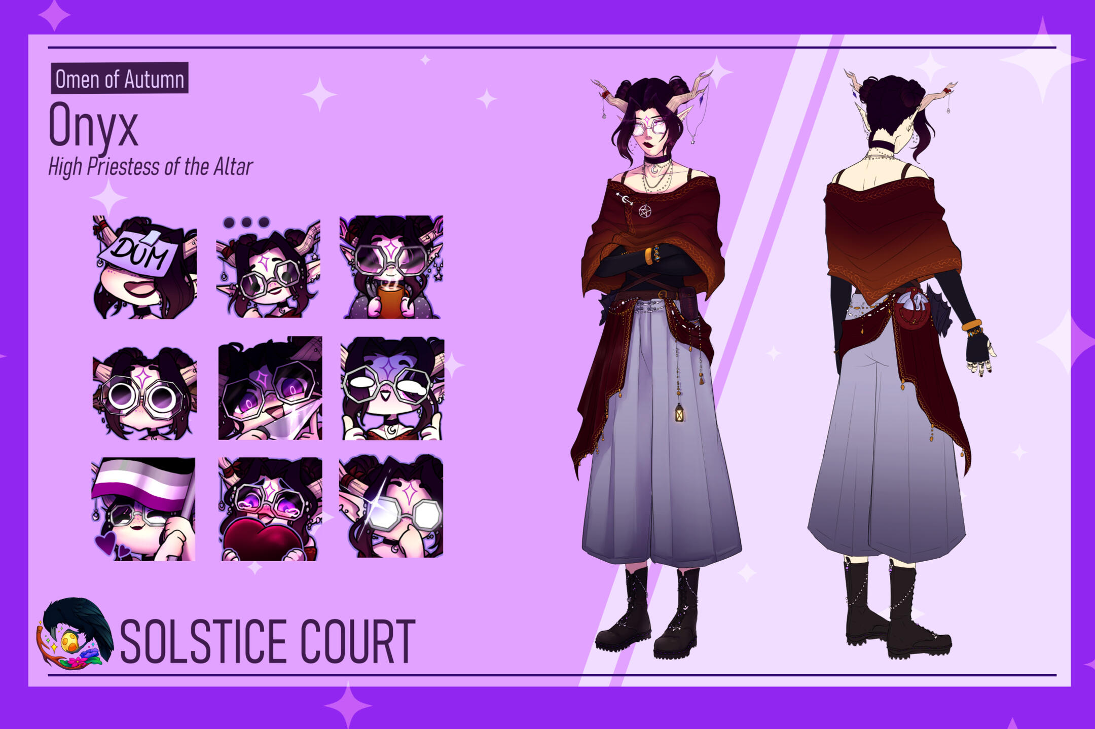 Hello, and welcome to the Solstice Court! We are a group of Twitch streamers who play games, create art, and love to hang out with new friends.The Court contains four distinct realms, each belonging to a different member and season. These spaces are reflections of their worlds: from the hallowed grounds of the Soulhollow to the lively warmth of the Hatchery, the whispered divinations of the Oracle's Altar, and the whimsical curiosities of the Verdant Bounds.Please feel free to look around and join us amongst our other social platforms. Our official debut week on Twitch is 25Jan26 to 31Jan26 ❤️