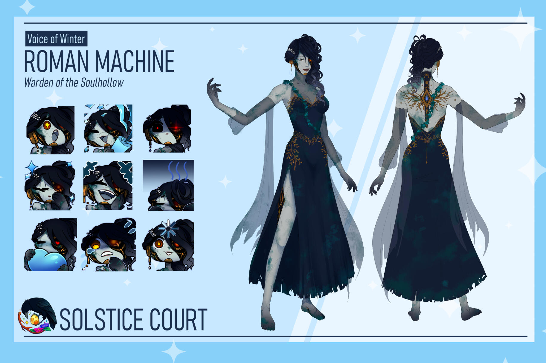 Each Court member has their own character sheet outlining some personality basics, likes, dislikes, etc. You can also find some condensed character lore! If you see something on their sheet that sparks your curiosity, you can find each members individual websites under the socials tab.