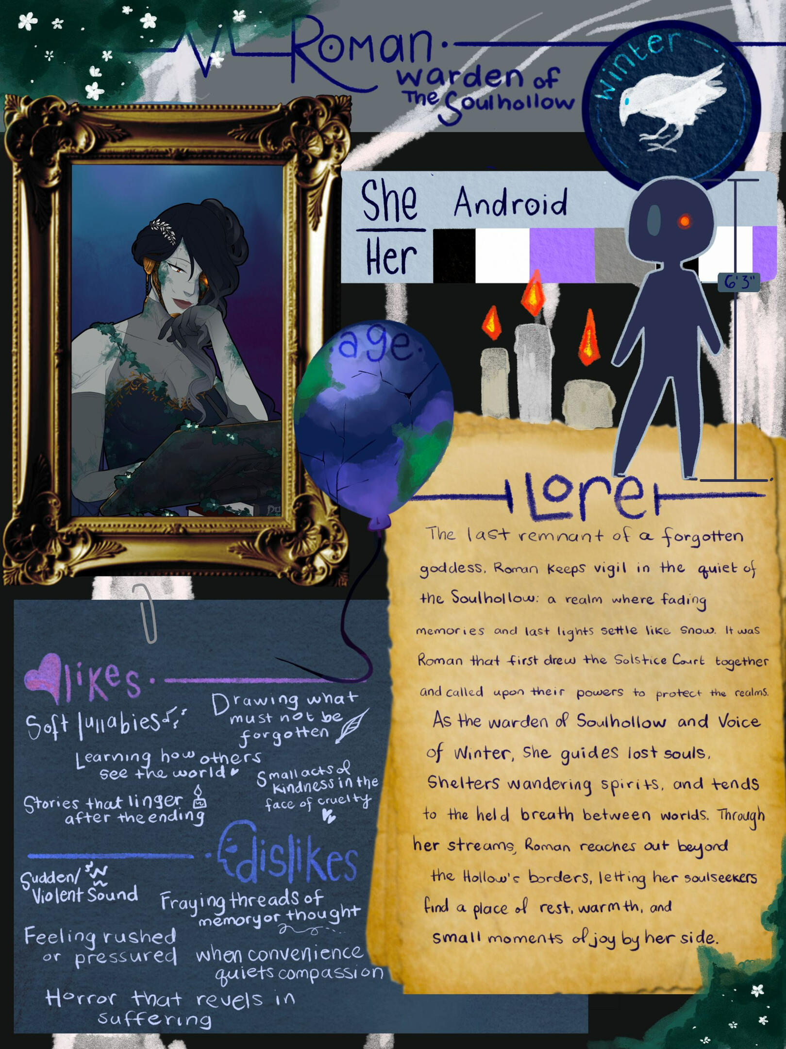 Lurking in the shadows of Winter, the Flux quietly grew stronger.The Winter chill did not phase its android warden Roman as she sang, her voice echoing around the serene domain, The Soulhollow. Her companion, a white feathered, blue-eyed raven known only as The Wanderer, hovered briefly before taking his place on her shoulder, squawking in greeting. She smiled, looking over her flock - each raven a soul-seeker, a guide from life into death and beyond.How long had it been since her goddess last tended the flock? She touched her face where the humanoid mask cracked, exposing a warm orange-red light. Of course, there was no point in repairing something so cosmetic - her friends and charges were unperturbed by her slow aging as small cracks appeared in her shell and moss dappled her chest and face. Her realm respected the concept of time passing, of things changing. Such was the nature of the Soulhollow,In her goddess’ wake, the once peaceful Soulhollow seemed unsettled. In her heart, mechanical though it may be, she knew it was more than the loss of her goddess. Something in the ether was thinning unnaturally, the way paper wears thin from too much use. What would it even mean for the Soulhollow? She’d never doubted her ability to support the realm left in her care, but when she noticed snow beginning to thaw, she called on some of her most trusted soul seekers.“Find the other seasons. It is time to convene the Court.”