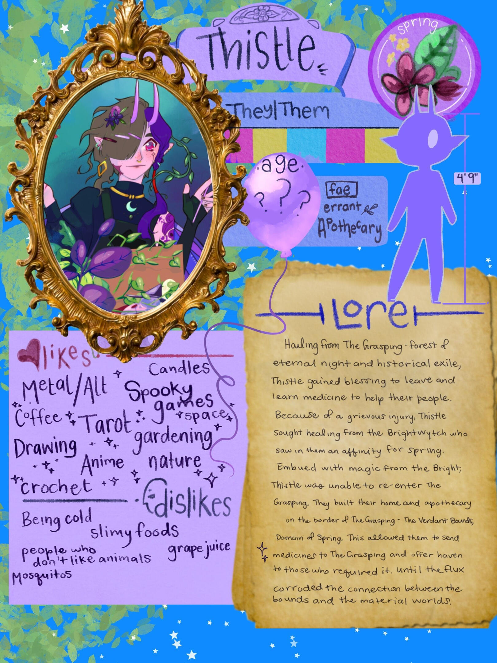 Thousands of years later, the Flux also came for Spring.The rough current of the Flux crashed down on the Verdant Bounds, realm of Spring, rattling loose years of dutifully tended gardens and distorting the land. Thistle, its keeper, tried to feel for the source of the onslaught, but it was wilder than their own chaos magic. They quickly moved to warding the Bounds, trying in vain to force the Flux out like redirecting water. Suddenly, Thistle realized that they’d underestimated the Flux as they felt the unthinkable happen.The delicate ecosystem they’d spent so long protecting was ripped from its place in the material plane, leaving only a vague path that the knowing traveler may use to find the apothecary fae and their shop. Worst of all to the homesick fae, their connection with Grand, the witch mother of their home just beyond the Verdant Bounds, was silent and cold. The deluge of the Flux ebbed as quickly as it had rushed in, leaving only a feeling of emptiness in its wake.Thistle warded and secured the Bounds, but it wasn’t enough - they were still far from where they had started. They tended what gardens remained and worked to repair the ones that had been disturbed. As they took the remains of a chamomile bunch into their hands and swallowed tears, a raven circled. Thistle recognized the unearthly raven when it landed. They often stopped in the Bounds for rest and they were always there, waiting patiently, as Thistle watched a patient move on from this life.“You felt it, too, huh?” They said with a tight laugh.“You aren’t alone. The other realms suffer as well,” it responded in a voice no one else could hear.